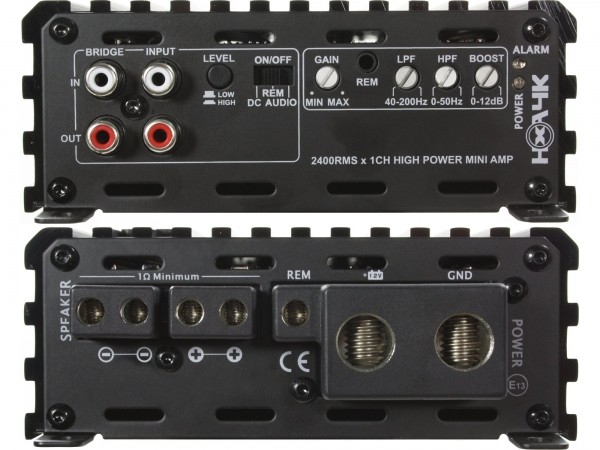 monoblok, 2400 W RMS na 1 Ω, trieda D, vysokoúrovňový vstup