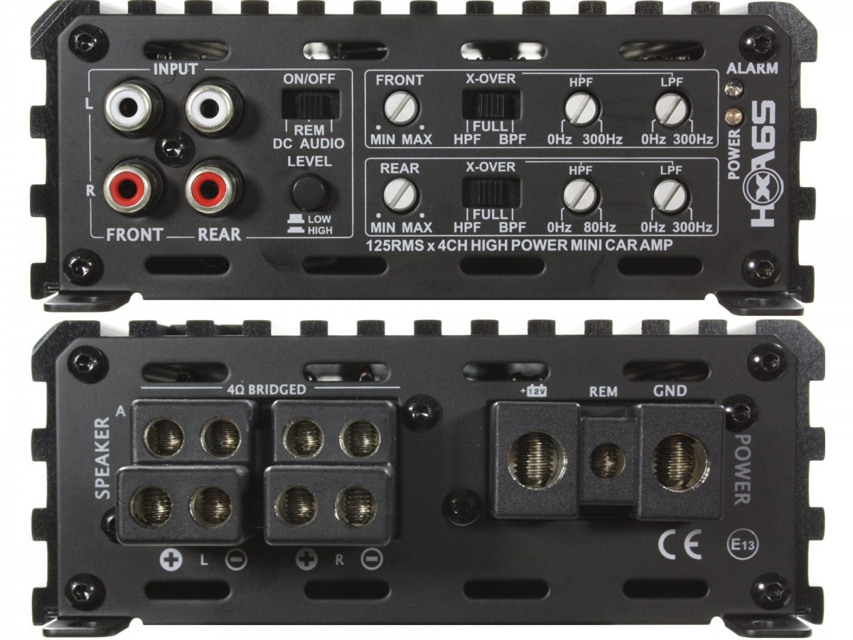 4kanálový, 4 x 100/2 x 250 W RMS na 4 Ω, trieda A, vysokoúrovňový vstup