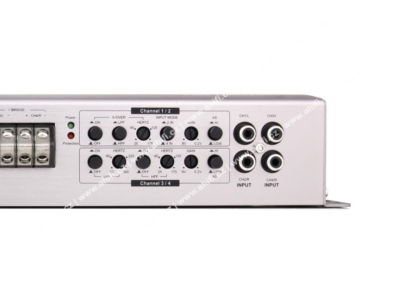 4kanálový, 4 x 102 / 2 x 300 na 4 Ω / 4 x 150 W RMS na 2 Ω, trieda AB, vysokoúrovňový vstup