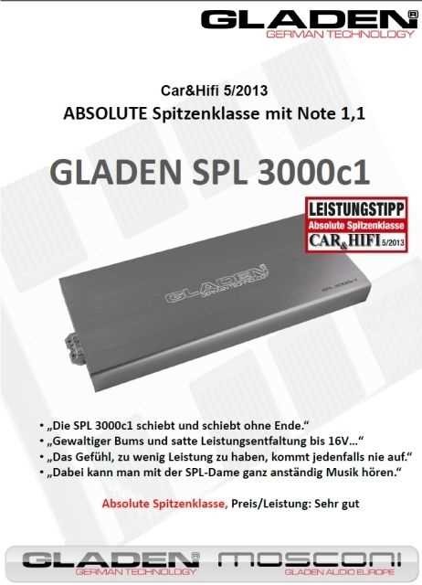 Extrémne výkonný 1kanálový zosilňovač určený hlavne pre veľmi výkonné subwoofery. Skvelo hodnotený v nemeckom časopise Car & Hifi. Výkonu mý naozaj na rozdávanie. Gladen sa nebojí ani takto výkonných mašín.| Katalógové číslo | SPL 3000C1 |