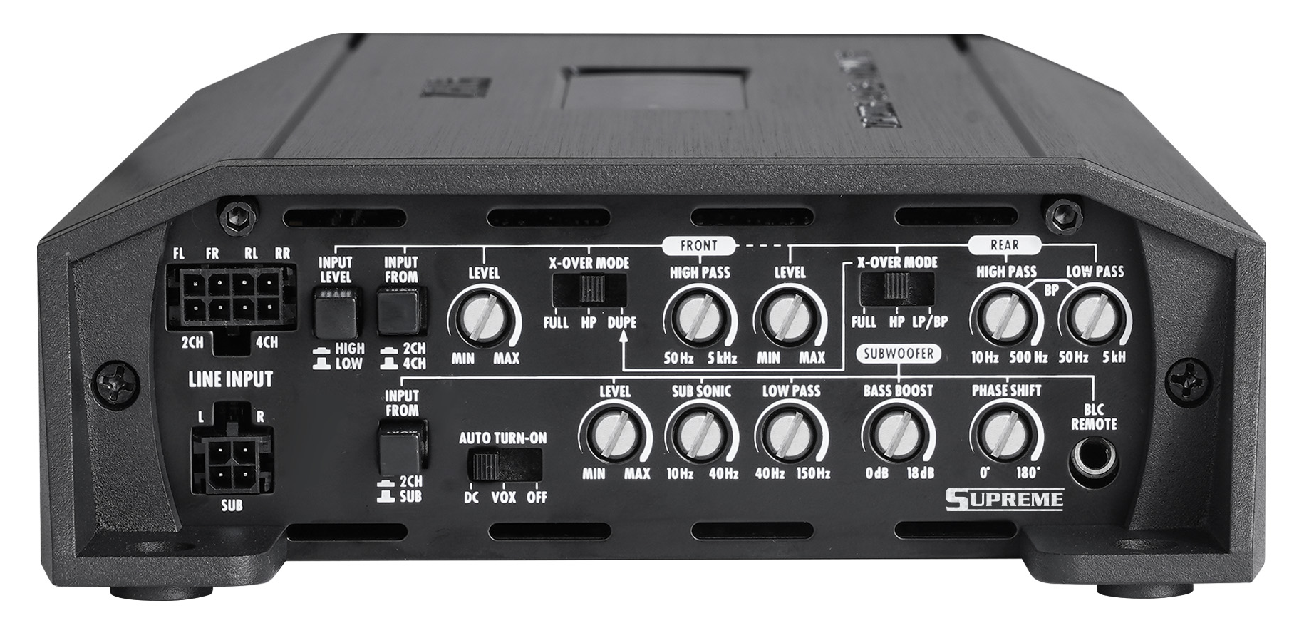 5-kanálový zosilňovač, 4 x 70 / 1 x 200 W RMS (4 Ω), 4 x 100 / 1 x 325 W RMS (2 Ω), 1 x 500 W RMS (1 Ω), trieda D