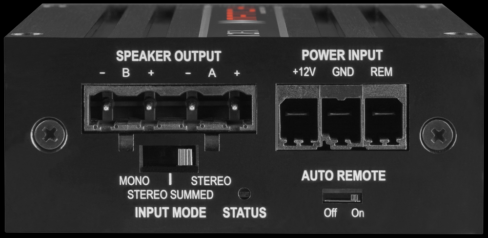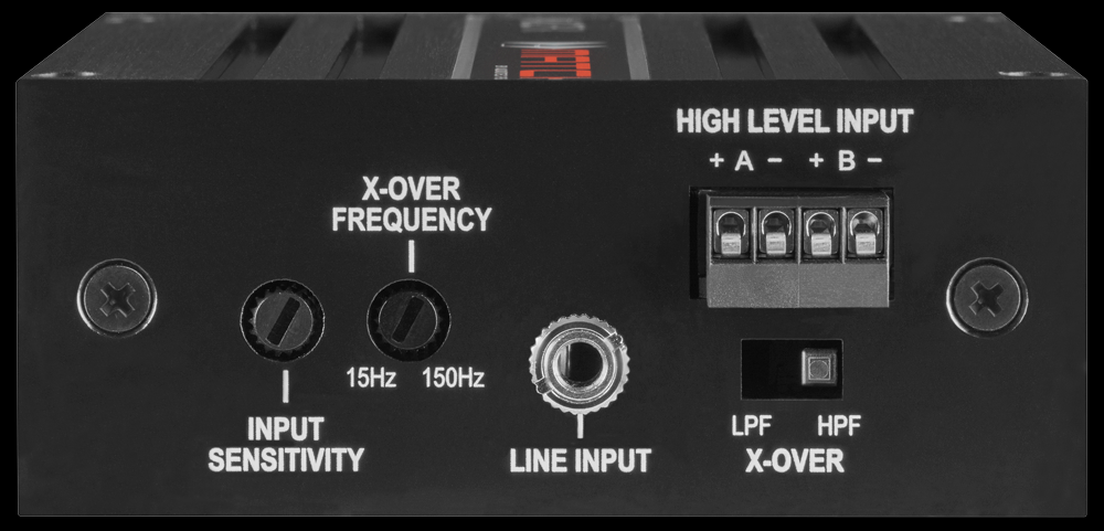 2kanálový, 2 x 125 na 4 Ω / 2 x 220 W RMS na 2 Ω, trieda GD, vysokoúrovňový vstup