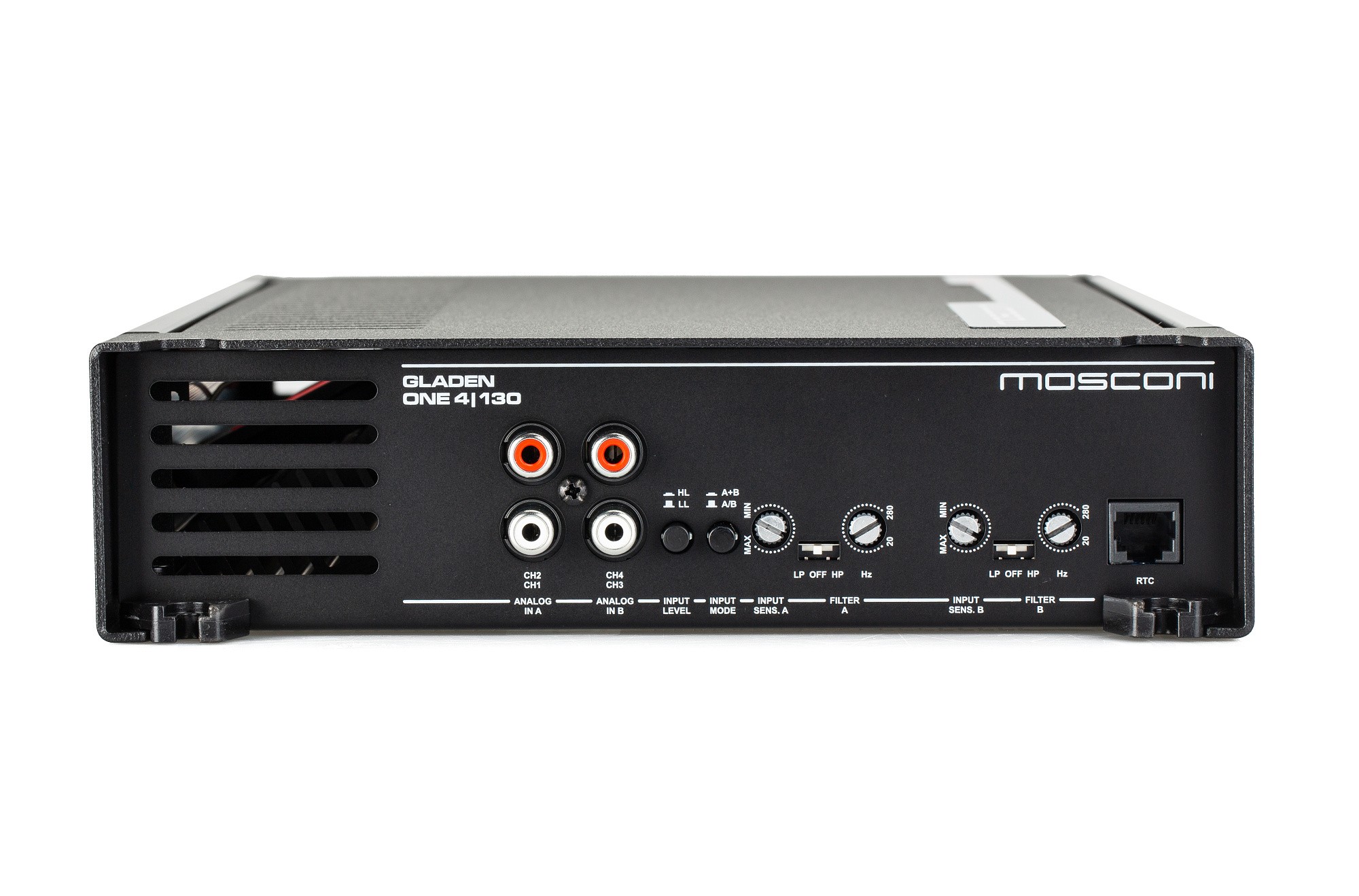 MOSCONI ONE 4|130 je univerzálny 4kanálový vysoko kvalitný zosilňovač v technológii triedy AB. Je to ideálny zosilňovač pre reproduktorové systémy alebo stredne veľké subwoofery. ONE 4|130 je navrhnutý ako dvojitý stereo zosilňovač, ale je možné ho prevádzkovať aj v troj alebo dvojkanálovom režime. Tento zosilňovač je výkonný a vďaka analógovej technológii Full Mosfet má vynikajúce zvukové vlastnosti. Rad GLADEN ONE je bestsellerom a chrbticou mnohých kompletných systémov. Cieľom vývoja bolo vytvoriť nekomplikované, univerzálne zosilňovače s veľmi dobrým zvukom a dynamikou. So svojimi flexibilnými vstupmi poskytuje rad GLADEN ONE taktiež počiatočnú iskru pre hifi u továrenských hlavných jednotiek.