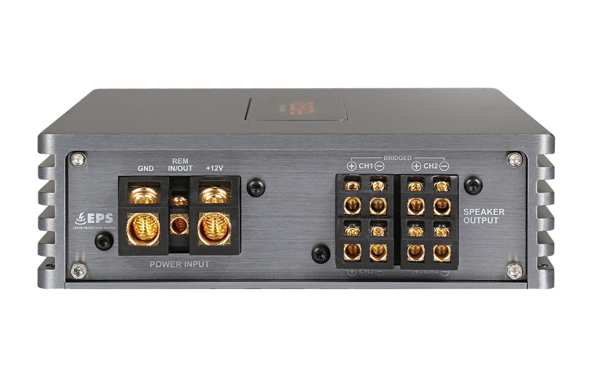 4kanálový zosilňovač, 4 x 120 / 2 x 400 W RMS (4 Ω), trieda D, diaľkové ovládanie, kompaktné rozmery