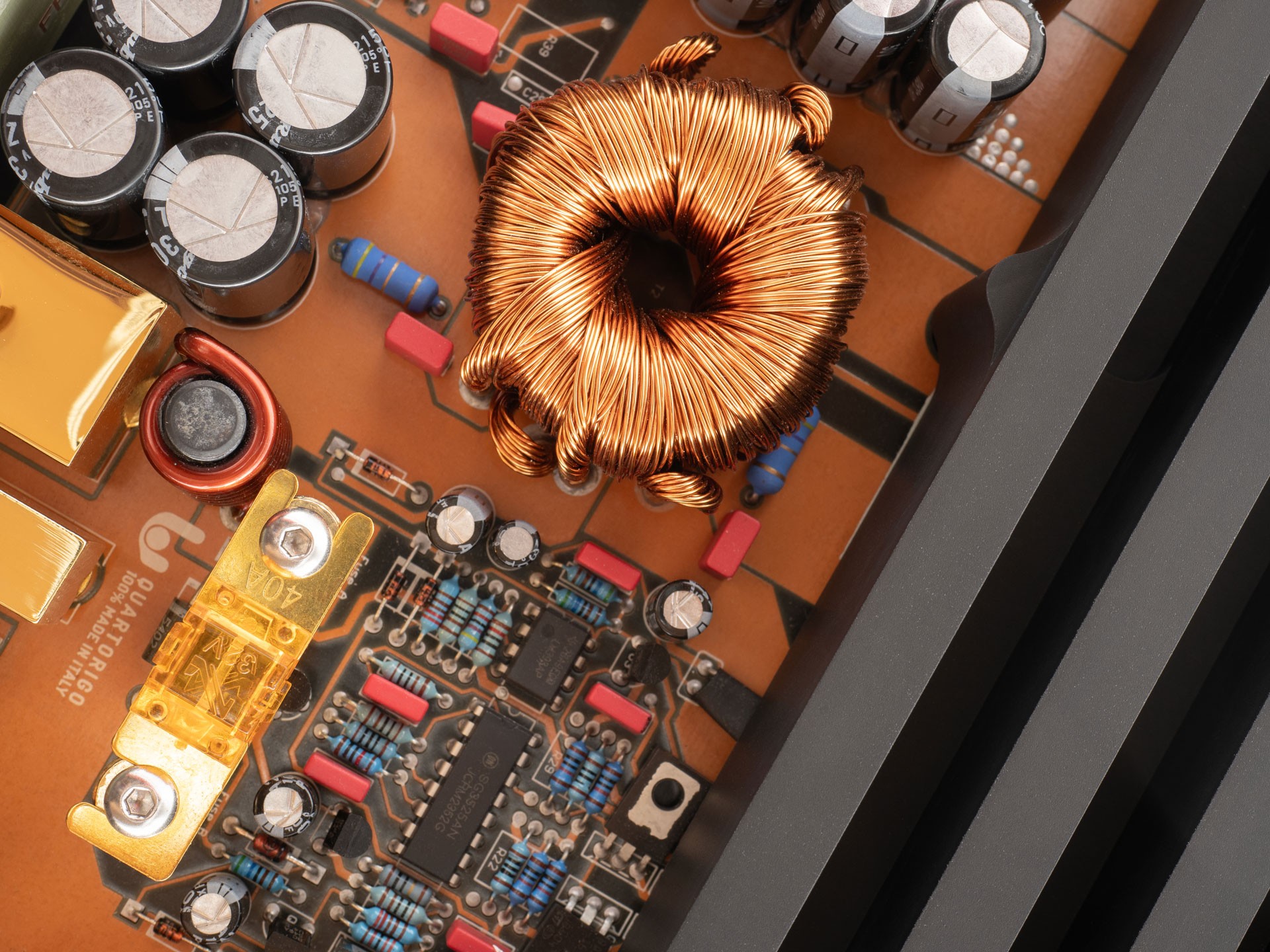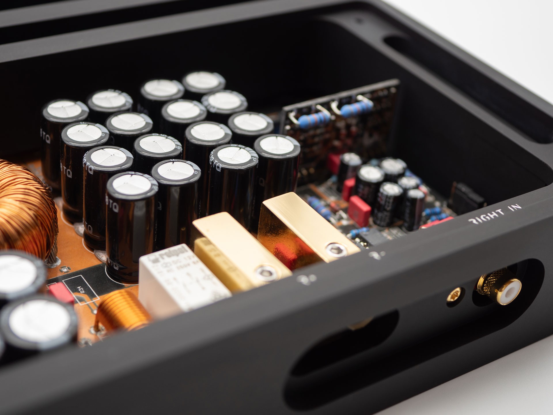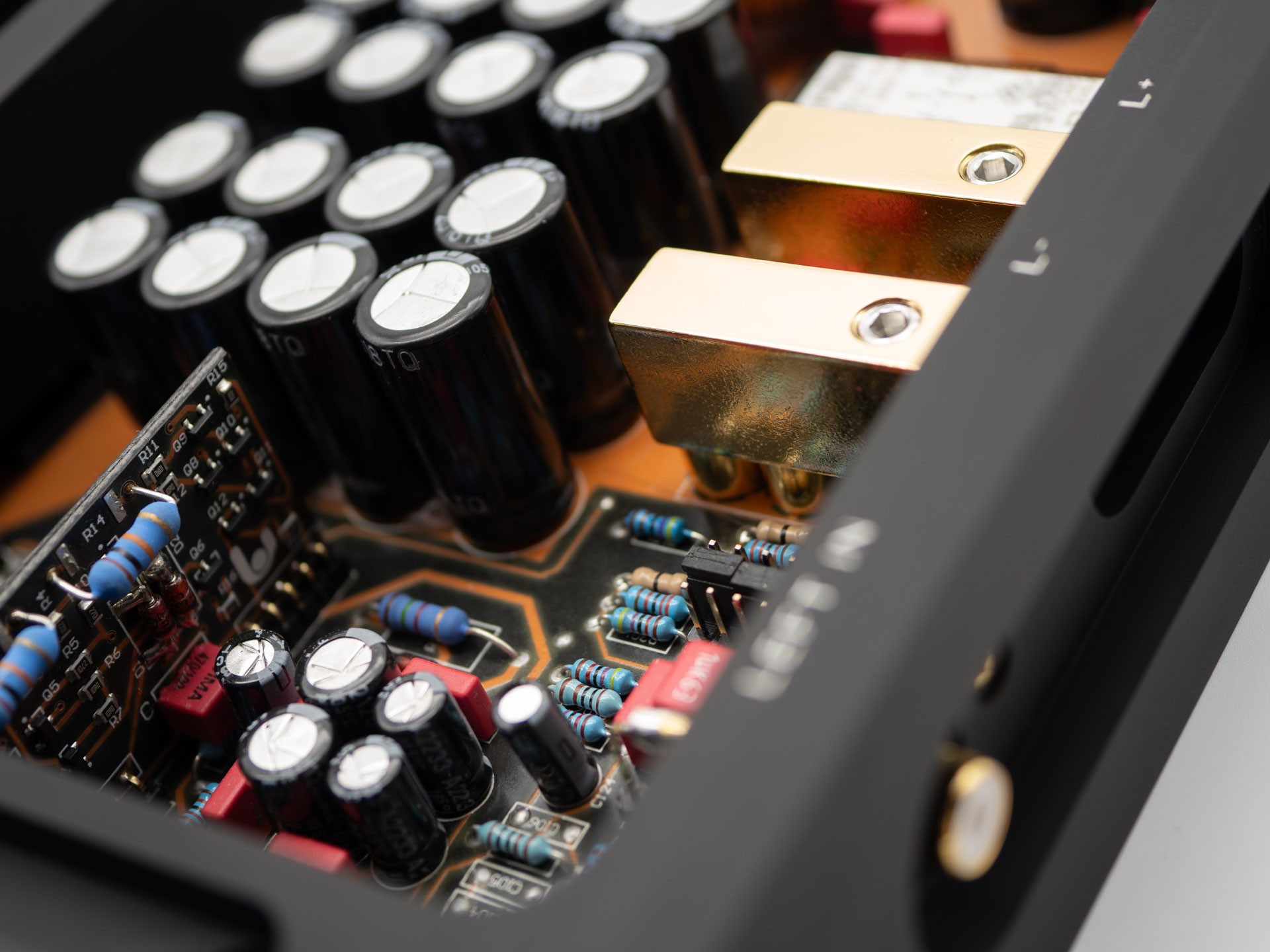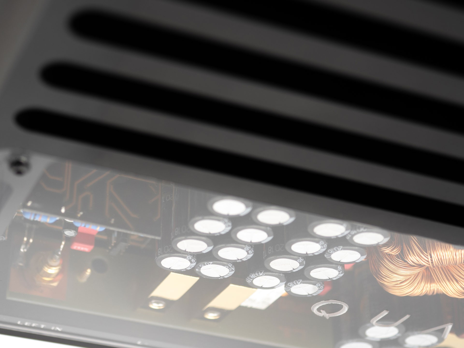 Napájací zdroj i zosilňovacie stupne sú vybavené viacerými veľkokapacitnými kondenzátormi, ktoré zabezpečujú stabilné napájanie a vysokú prúdovú rezervu. Použité sú výhradne starostlivo vybrané komponenty, ktorých presné rozmiestnenie v kombinácii s krátkymi a širokými signálovými cestami tvorí jeden z kľúčov k vysokému výkonu a zvukovej kvalite týchto zosilňovačov.