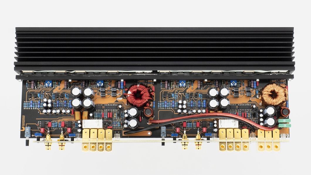 Pokiaľ nahliadneme do útrob zosilňovača, nasleduje naozaj krásny pohľad. Precízne spracovanie a výnimočné komponenty sú základom budúceho úspechu týchto zosilňovačov. Hlavným stavebným kameňom zosilňovača je obojstranná doska plošných spojov s optimalizovanými dráhami, ktoré zaisťujú vynikajúcu stabilitu a elektrickú aj mechanickú odolnosť. Všetky výkonové tranzistory sú zoradené na jednej strane základnej dosky, kde sú spojené s chladičom cez hliníkovú lištu a tým od neho elektricky izolované. Toroidné transformátory sú predimenzované a konštruované s mnohonásobným vynutím. Trimre umiestnené na vstupnom signále sú prepojené jeden po druhom a zároveň na signálovej ceste nie je prítomný žiadny elektrolytický kondenzátor. Aby sa zabránilo bumpu v reproduktoroch, používajú sa vysoko kvalitné relé na odpojenie zvukového signálu pri zapínaní a vypínaní zosilňovača. Embosované RCA konektory výrazne zlepšujú stabilitu spojenia so signálovými káblami a to aj v náročných podmienkach počas agresívnejšej jazdy.