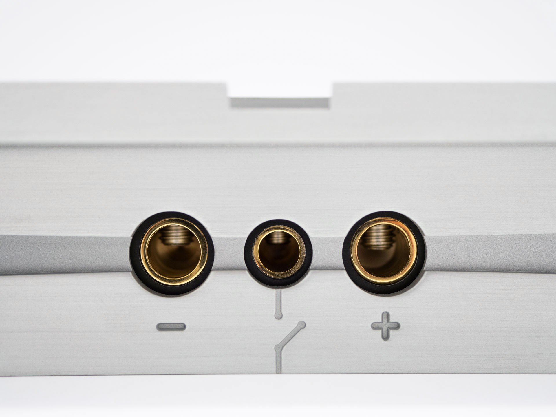 - Reproduktorové a napájacie konektory obrábané na CNC z medeného bloku, finálne pozlátené.