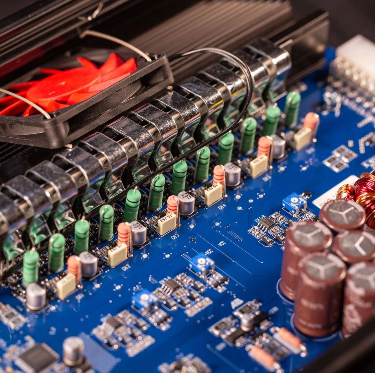 - Vstavaný vetráčik pre aktívne chladenie zosilňovača.