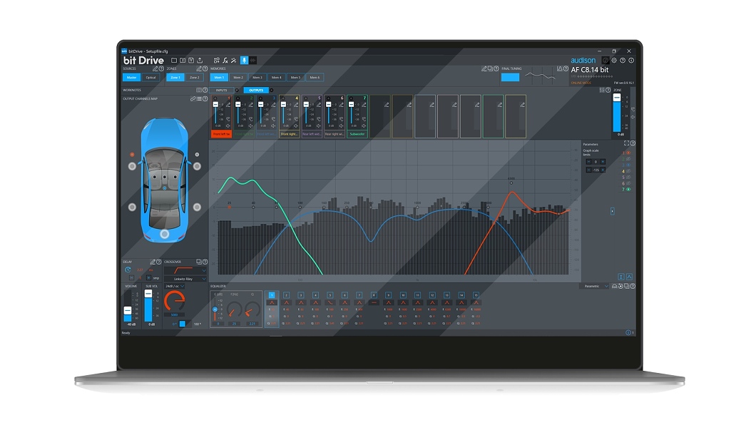 Úplne nový bit Drive PC softvér Audison dokáže analyzovať, smerovať a korigovať signál úplne novými spôsobmi - teraz môžete merať, miešať a nakoniec vyladiť zvuk pomocou jedného výkonného nástroja! Nové grafické užívateľské rozhranie zjednodušuje každé ovládanie a funkciu, integruje akustické meranie a zaisťuje efektívne ladenie a skvelý zvuk! Acoustic RTA je integrovaný do grafu ekvalizéra a je kompatibilný s vašim USB mikrofónom alebo zvukovou kartou. Funkcia Final EQ umožňuje konečnú ekvalizáciu bez poškodenia jemných vzťahov medzi ľavou a pravou frekvenciou. Šesť spracovaných výstupov predzosilňovača je navyše k ôsmim zosilneným kanálom, čo umožňuje sekcii DSP spoločnosti Forza ľahko spravovať väčší systém.
