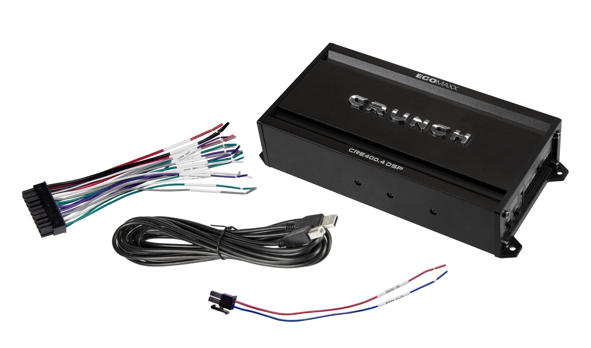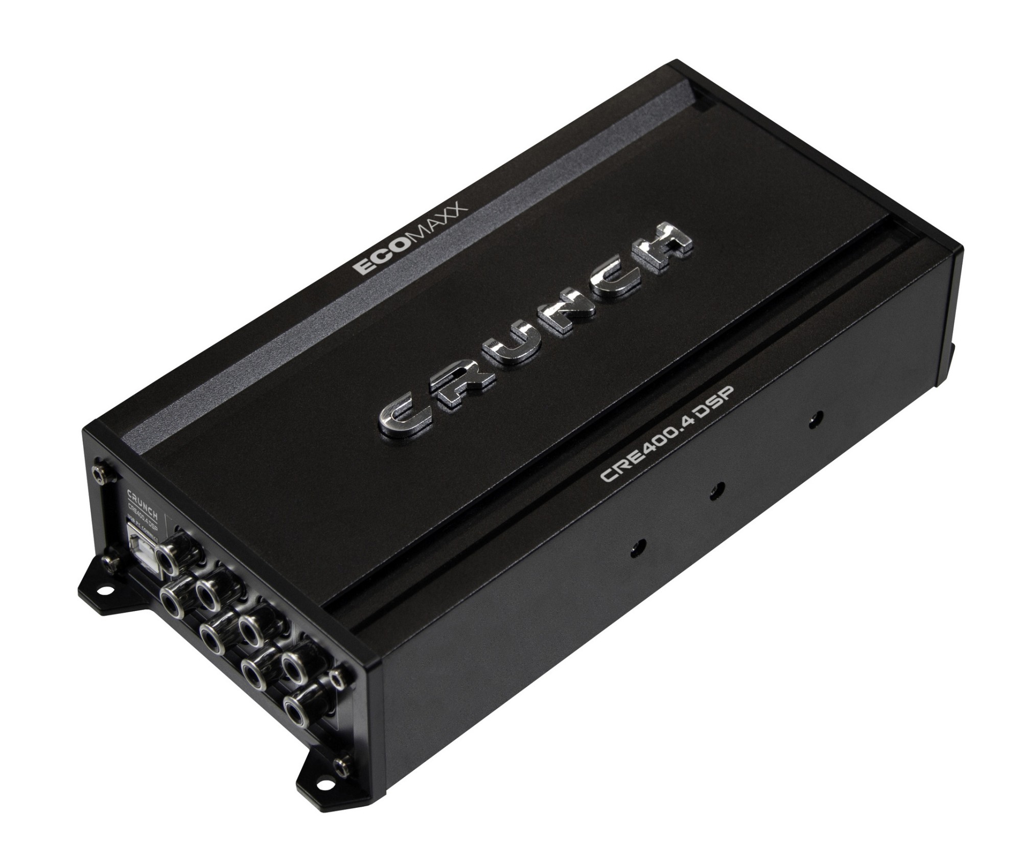 Crunch CRE400.4DSP je kompaktný štvorkanálový zosilňovač s integrovaným 6-kanálovým DSP procesorom, ktorý umožňuje komplexné riadenie predného a zadného systému a súčasne ponúka samostatný RCA výstup pre pripojenie ďalšieho zosilňovača napríklad pre subwoofer. Konštrukcia kombinuje analógovú štvorkanálovú koncovú časť s digitálnym procesorom v jednom kompaktnom tele, čo z neho robí praktické riešenie pre inštalácie, kde je požadované aktívne riadenie systému bez použitia externého DSP. O spracovanie signálu sa stará 32bitový Dual Core DSP s kvalitnými A/D prevodníkmi AKM, ktoré prispievajú k nízkemu skresleniu a čistej reprodukcii. K dispozícii je parametrický 31-pásmový ekvalizér, časové korekcie a výhybky s nastaviteľnou strmosťou až 48 dB / okt., čo umožňuje presné nastavenie aktívnych i poloaktívnych systémov. Pre rýchle nastavenie je v zosilňovači pripravených 9 predinštalovaných presetov prispôsobených rôznym veľkostiam vozidla a posluchovým preferenciám. Súčasťou výbavy je integrovaný Bluetooth modul s podporou A2DP / aptX pre bezdrôtové streamovanie hudby. DSP je možné nastavovať klasicky cez PC software (Windows) pomocou USB pripojenia, alebo bezdrôtovo prostredníctvom aplikácie pre iOS a Android. Zosilňovač je vybavený vysokonapäťovými vstupmi, AUX vstupom, Bluetooth audio vstupom, šiestimi RCA výstupmi pre ďalšie spracovanie signálu a funkciou automatického zapnutia aj REM OUT pre riadenie ďalších zariadení.