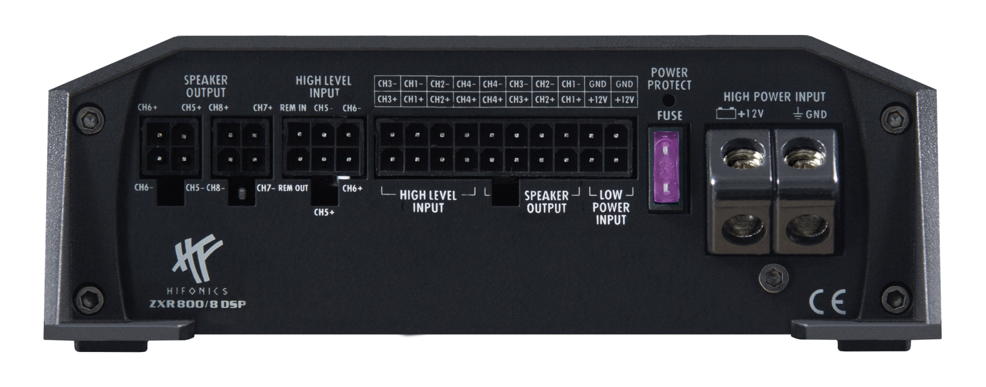 DSP zosilňovač sa vyznačuje tým, že kombinuje dve zariadenia v jednom tele. U väčšiny týchto kombinácií sú však určité DSP kanály pevne priradené k jednotlivým zosilňovačovým kanálom, pričom počet voľne konfigurovateľných výstupov býva obmedzený. Hifonics u modelu ZXR800/8DSP zvolil inovatívnejší prístup - integrovaný 10kanálový DSP možno používať nielen interne, ale aj úplne externe, ako keby ste mali samostatný „stand-alone“ DSP. To zaisťuje maximálnu flexibilitu: 2, 4, 6, 8 alebo dokonca všetkých 10 kanálov môžete využiť pre externé zosilňovače. Tento koncept umožňuje modulárne rozširovanie ozvučenia vo viacerých krokoch, nie ako doplnok, ale ako základnú filozofiu značky Hifonics.