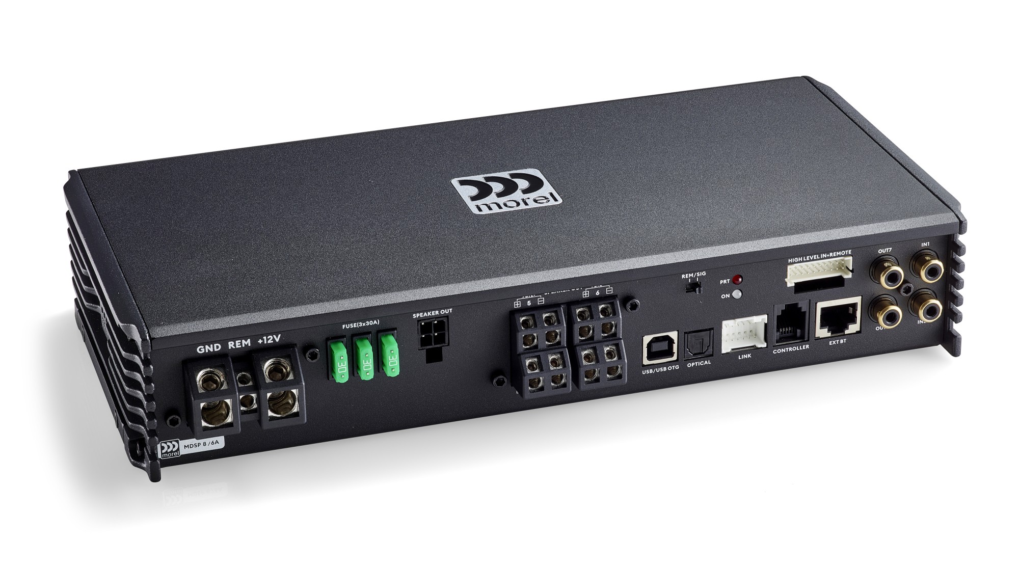 6kanálový zosilňovač s DSP procesorom, 2 x 80 + 4 x 160 / 2 x 320 W RMS (4 Ω), 8kanálový DSP, USB OTG, SPDIF, trieda D