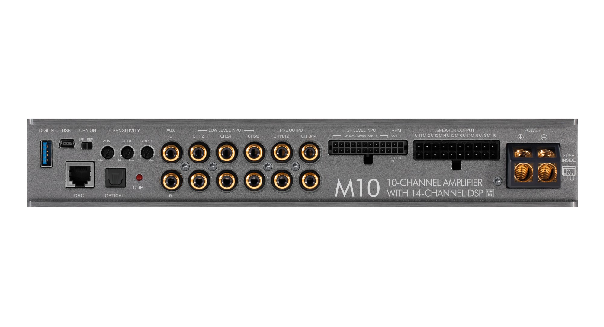 10kanálový zosilňovač s DSP procesorom, 8 × 80 + 2 x 120 / 1 x 440 W RMS (4 Ω), trieda D, vstupy: 10 × high-level, 6 × RCA, AUX, optický SPDIF, výstupy: 4 × RCA