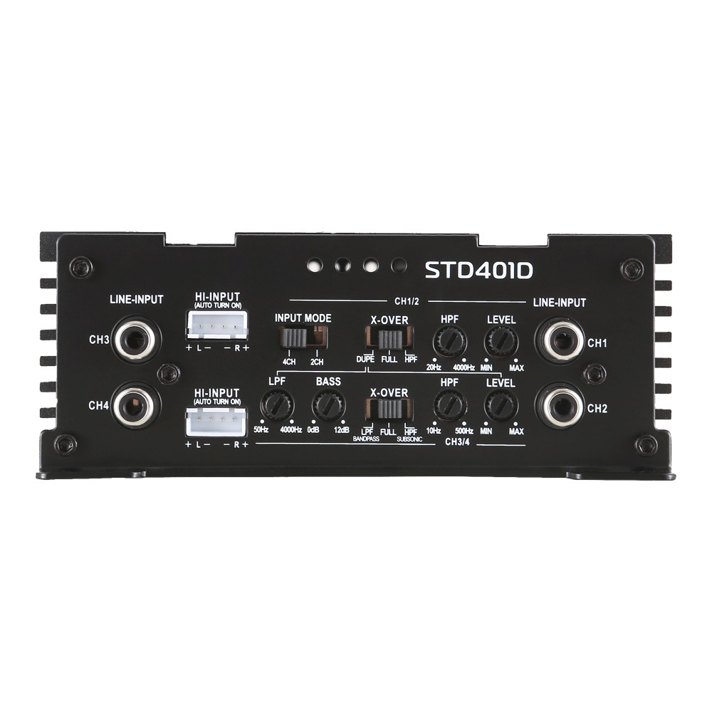 | Horná pásmová priepusť (HPF) HPF / HP resp. "Hi pass filter" ponúka možnosť nastavenia zosilňovača pomocou potenciometra tak, aby stredná, prípadne stredobasové a výškové frekvencie hrali od určitej frekvencie smerom nahor. Príklad: Zosilňovače majú najčastejšie HPF od 40 do 300 Hz. Ak nastavíme na potenciometra hodnotu cca. 150 Hz, budú zvuk orezaný tak, že bude hrať frekvencie od 150 Hz až po maximálnu hornú hranicu celého frekvenčného rozsahu zosilňovače, napríklad až 20.000 Hz. Odporúčame nastavovať tento potenciometer v rozmedzí 80-160 Hz. Vďaka tejto možnosti nastavenia znesú reproduktory vyšší výkon, pretože ich nebudete preťažovať basy v spodnom frekvenčnom pásme. | 20 - 4000 Hz |