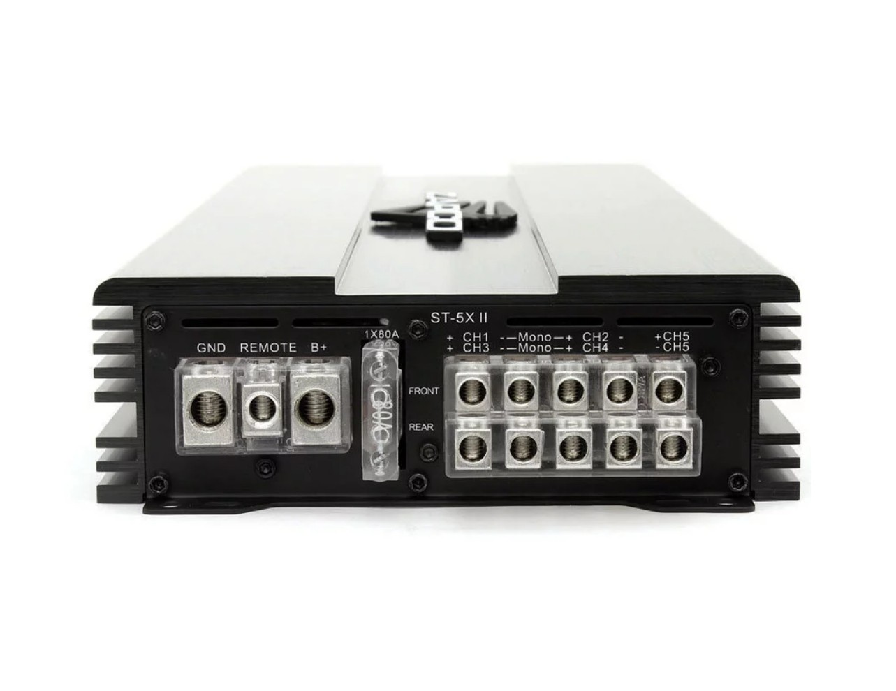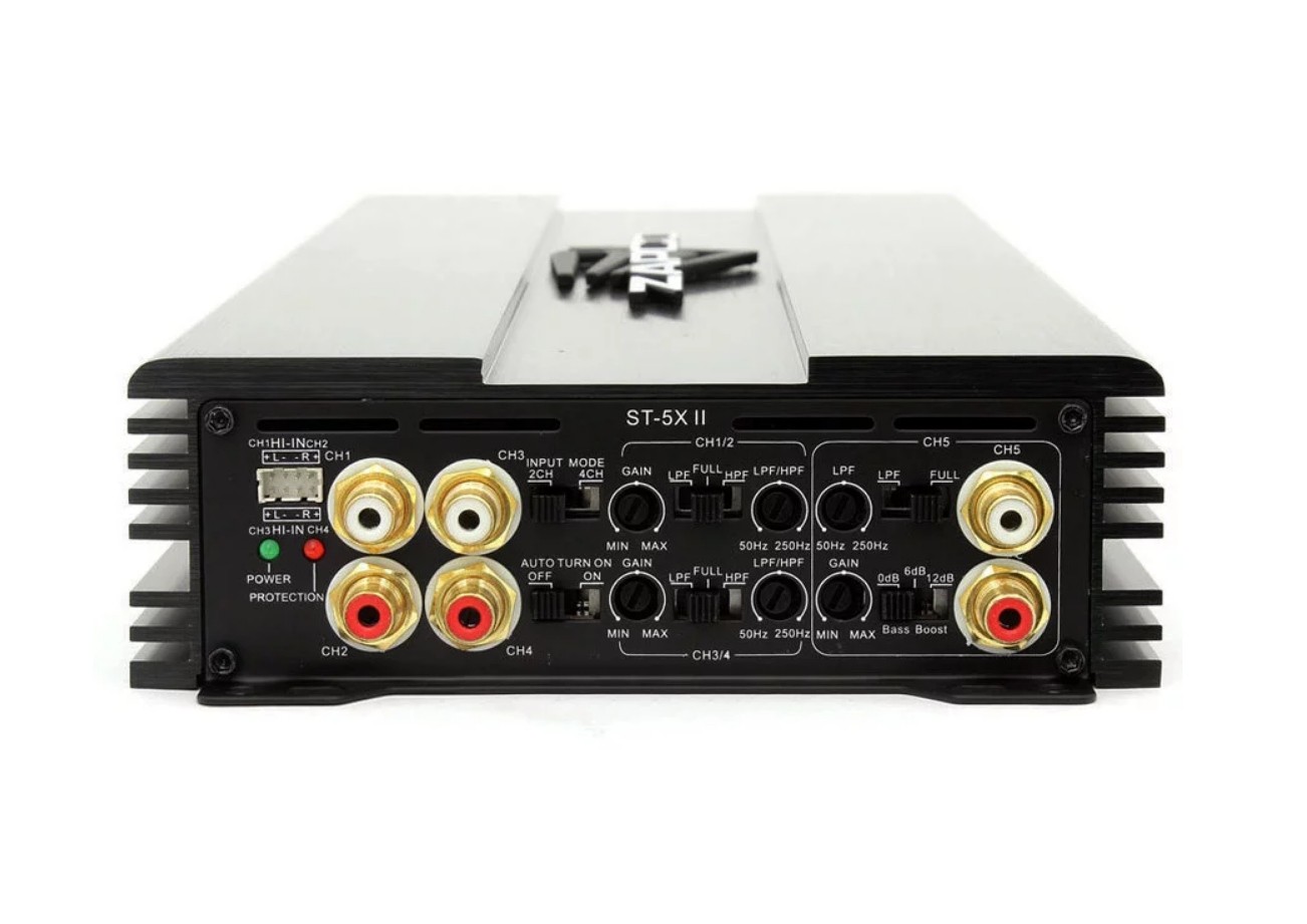 Rad zosilňovačov Studio-X od spoločnosti Zapco bol navrhnutý špeciálne pre dnešný automobilový audio trh. Kompaktné šasi Studio-X umožňuje jednoduchú montáž do akéhokoľvek auta a vďaka modernému hranatému designu v čiernej farbe zosilňovača vyzerajú skvele v každej inštalácii. Zapco ST-5X je univerzálny all in one zosilňovač modelového radu Studio-X s výkonom 100 W RMS na kanál ak tomu s piatym kanálom pre subwoofer s výkonom 200 W RMS pri 4 ohmoch. Ide o skutočnú elektráreň v kompaktnom šasi. Rovnako ako ostatné zosilňovače ST-X je aj ST-5X triedy A/B a to dokonca aj na basovom kanáli, takže získate presné a silné basy. Tento zosilňovač môžete premostiť a tiež získať vyšší výkon pri zapojení na 2 Ω. Zosilňovač si so svojimi 300 W RMS pre subwoofer pri 2 ohmoch hravo poradí aj s výkonnými meničmi. ST-5X má prepínač vstupného režimu, takže môžete použiť všetkých šesť vstupných kanálov, alebo iba štyri či dva kanály. Pokiaľ teda máte iba stereofónnu hlavnú jednotku, je možné pohodlne riadiť predné a zadné reproduktory a subwoofer.